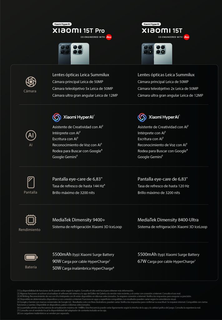 [1] La función estará disponible mediante actualización OTA a partir del 24 de septiembre de 2025. La disponibilidad de la función y el calendario de lanzamiento de la OTA pueden variar según el país. La Comunicación Offline de Xiaomi requiere una tarjeta SIM y una cuenta Xiaomi iniciada para funcionar. Es compatible con llamadas de voz en un rango de hasta 1,9 km en entornos abiertos y sin obstrucciones. La calidad real de la llamada puede variar según las condiciones del entorno. Por favor, consulta tu experiencia real. [2] 5500mAh hace referencia al valor típico de la capacidad de batería del Xiaomi 15T Pro. [3] Consulta con el vendedor local la disponibilidad del adaptador de corriente en la caja. [4] El cargador inalámbrico se vende por separado.